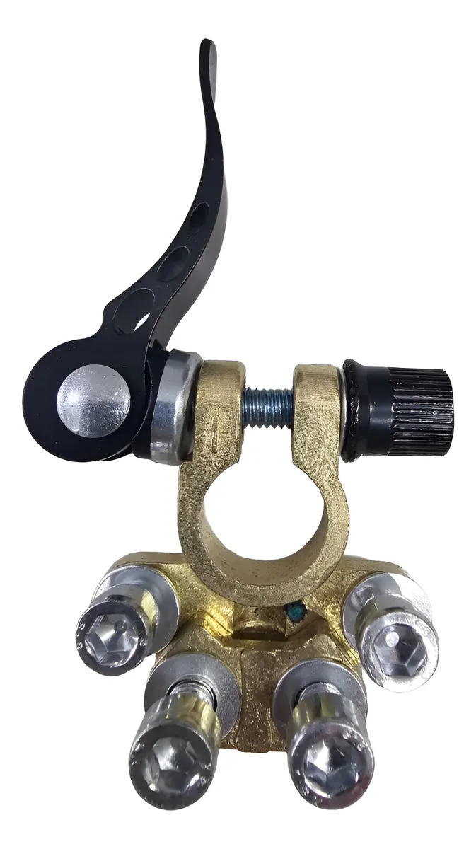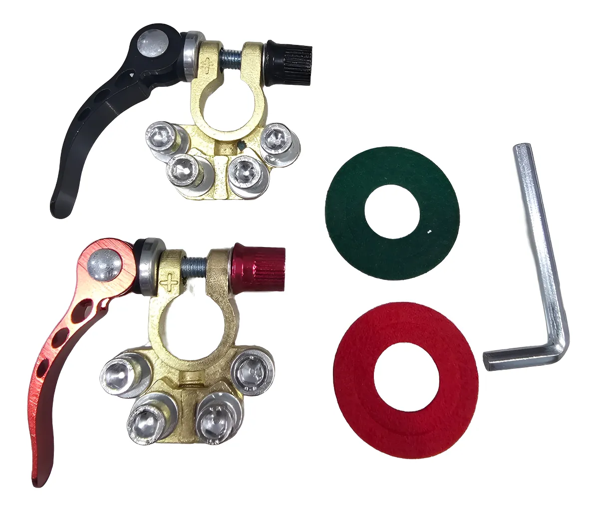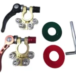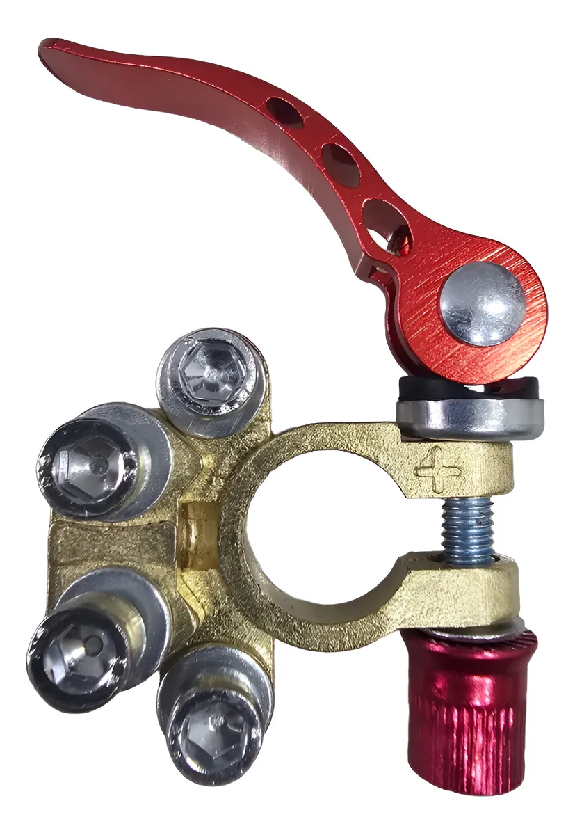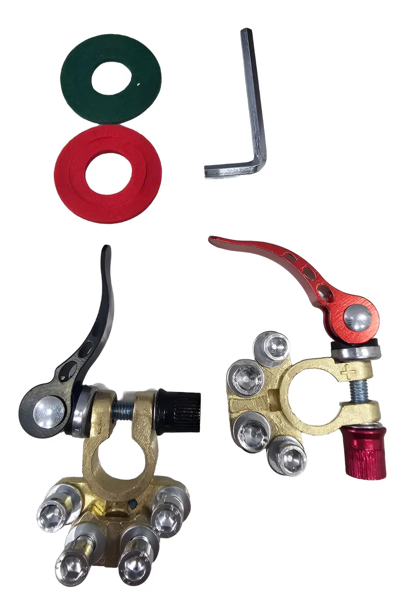 Par de Terminal De Engate Rápido Para Bateria Universal (Positivo/Negativo) Uso indicado: Carros, Caminhões, Trailers (RVs), Sistemas de Som Automotivo e outras aplicações com baterias Compatível com: Volkswagen: Fusca, Gol, Kombi, Voyage, Saveiro, Fox, Polo, Parati e outros.. Ford: Escort, Pampa, Belina Del Rey, Corcel, Fiesta, Ka, Courier e outros.. GM: Chevette, Monza, Opala, Kadett, Astra, Meriva, Vectra, Celta e outros.. Fiat 147, Uno, Fire, Prêmio, Palio, Tempra, Tipo, Idea, Siena, Stilo e outros.. Especificações: – Alavanca de segurança e Calço de proteção – Para Baterias de 12v e 24v – Composição: Metal, Bronze + Liga de Zinco Itens inclusos: – 01 par terminais sendo: 1pc Positivo e 1pc Negativo – 01 Chave Allen – 02 Calços de proteção de borne
